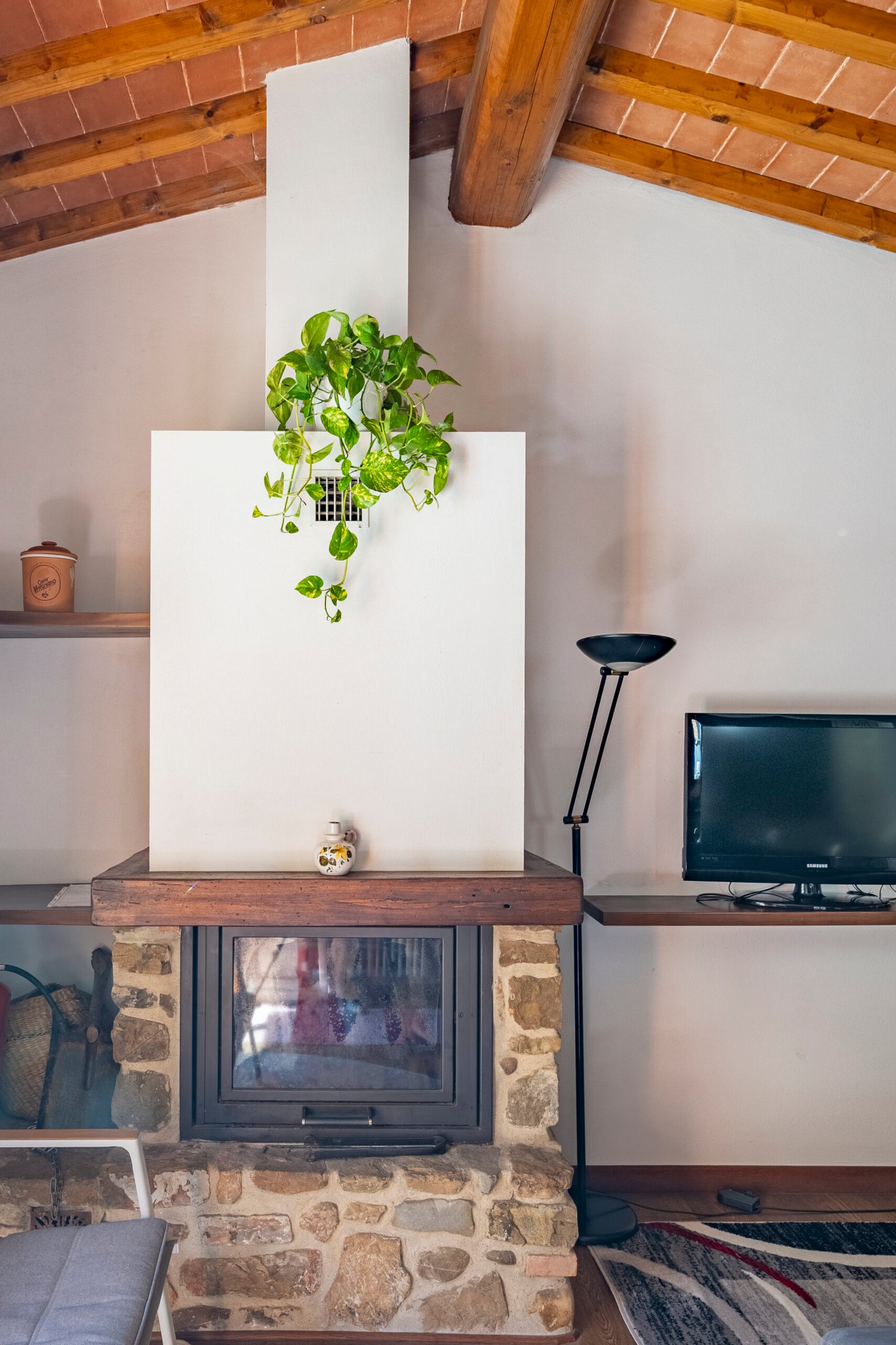 1) Salotto con cucina; entrate nella casa vi ritroverete nel salotto che vi ospiterà durante la vostra vacanza. Potrete utilizzare il comodo divano, la televisione e il camino. La cucina a vista è completa di ogni utensile necessario per preparare i vostri pasti!